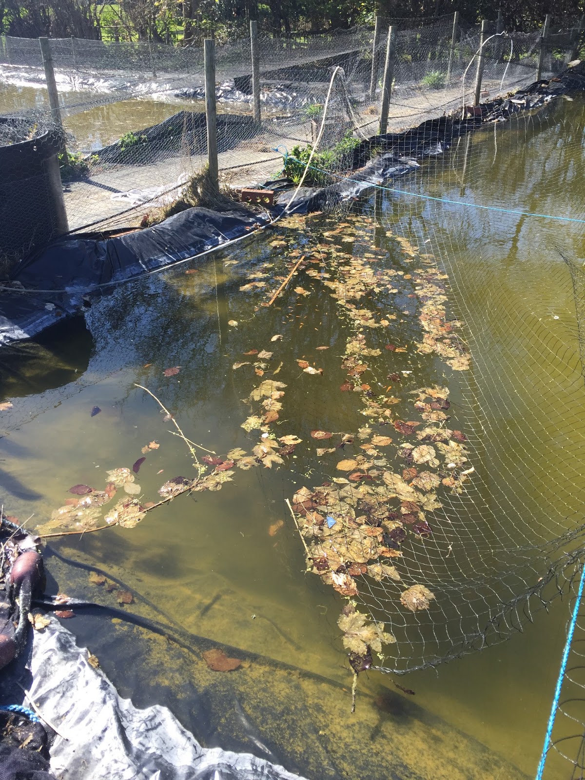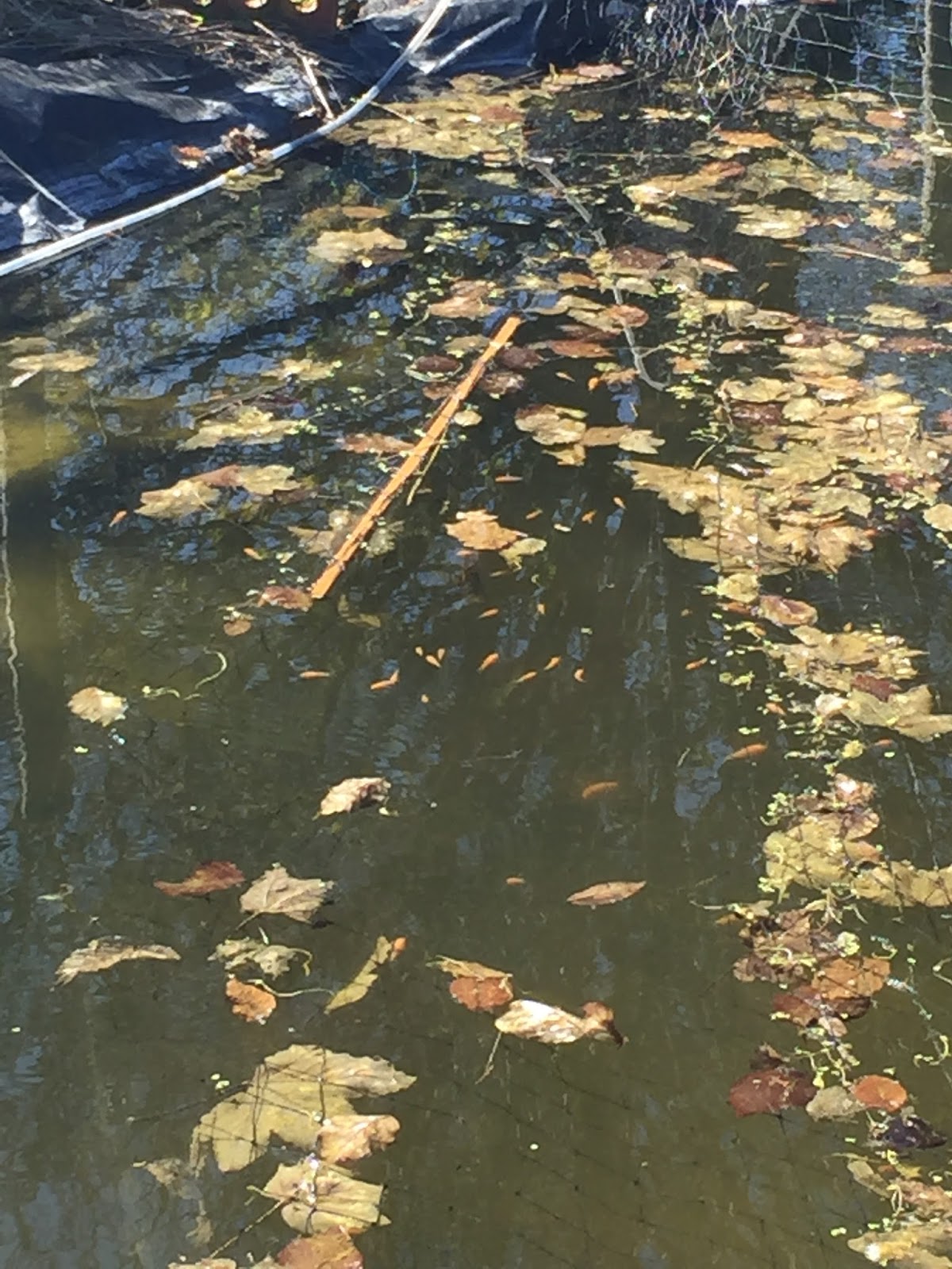 Showing them around, and walking the length of the fry ponds... we're starting to notice quite a few fry swimming around out there. These are left over from the late summer spawning. And they seem to be doing quite well. I measured the pond temperature today at 17C!