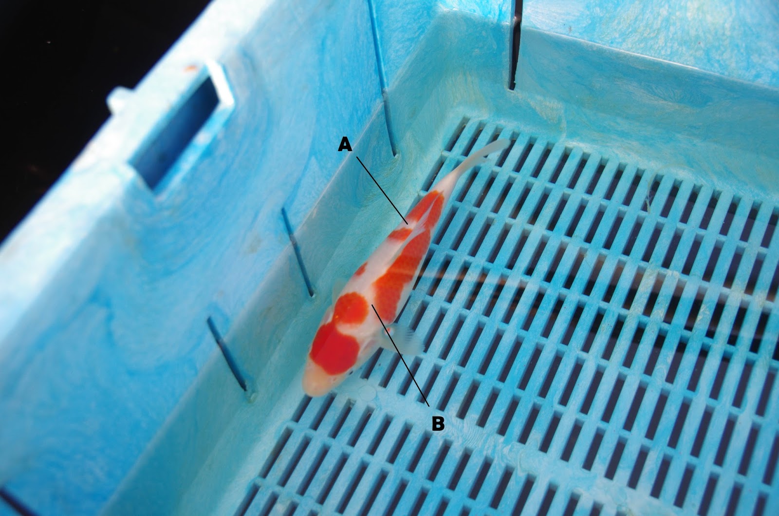 And here's the most recent photo, taken on the weekend of 21st / 22nd November. You can see the red at both points A and B is closing up the white gap! And, I'm not particualrly happy about it, especially around point B. On the upside, as it stands right now - the white on this fish is that best out of all the koi from that spawning. It's easy to spot when they're all in the tank together - and the white on the nose is much whiter than it's peers - only one other koi from that spawning comes close on the whiteness front; and that will be the subject of a separate case study.