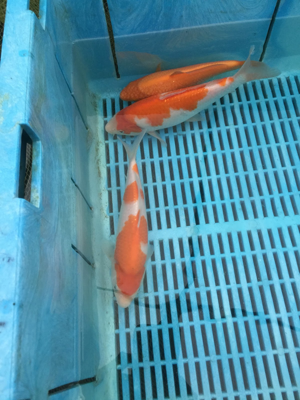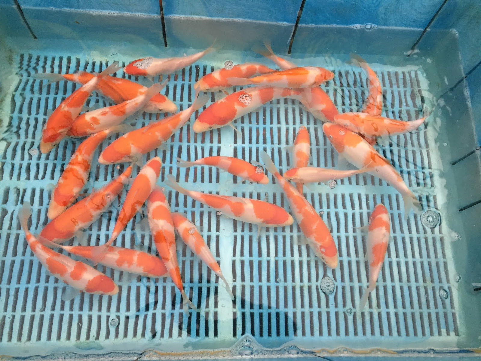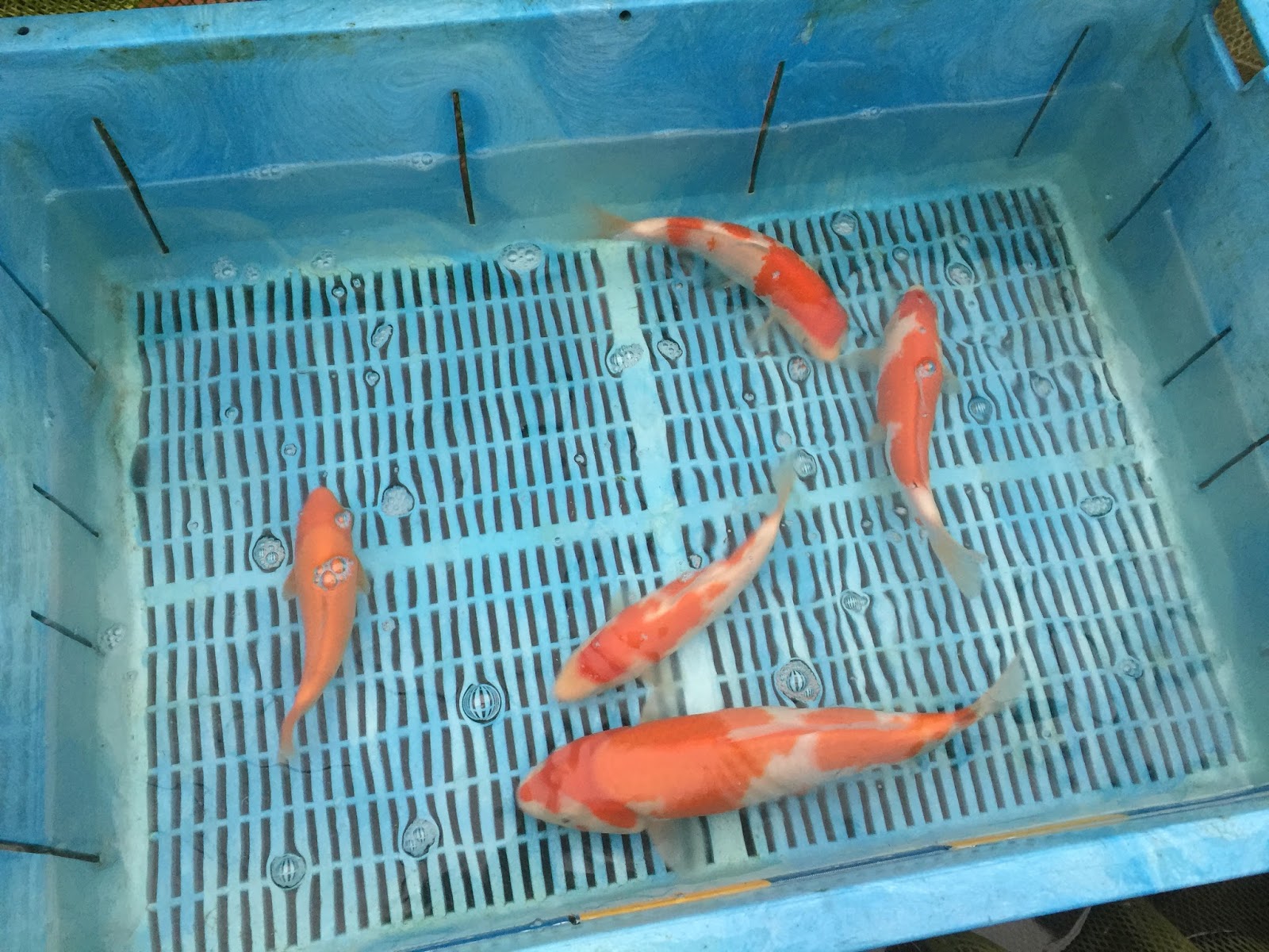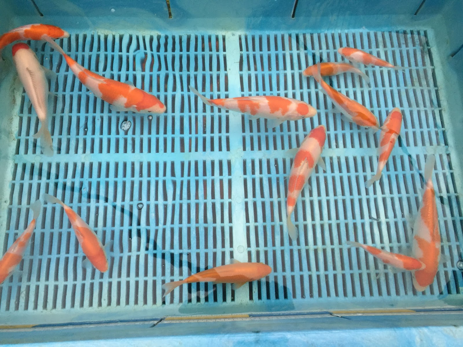 ok, a little convoluted... but, we do have an audit trail! a rule of thumb when looking at these photos is that if the koi is on the orange side - it's probably from the july 16 spawning. the reds are less well developed, partly because they are younger, and partly because the green vortex tank they've been raised in was covered.