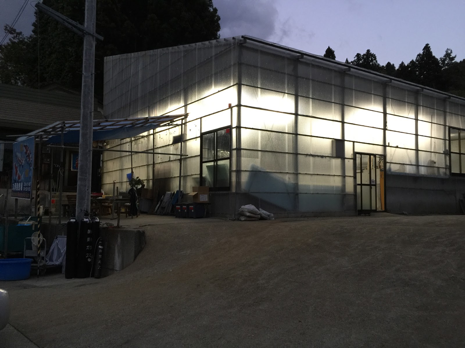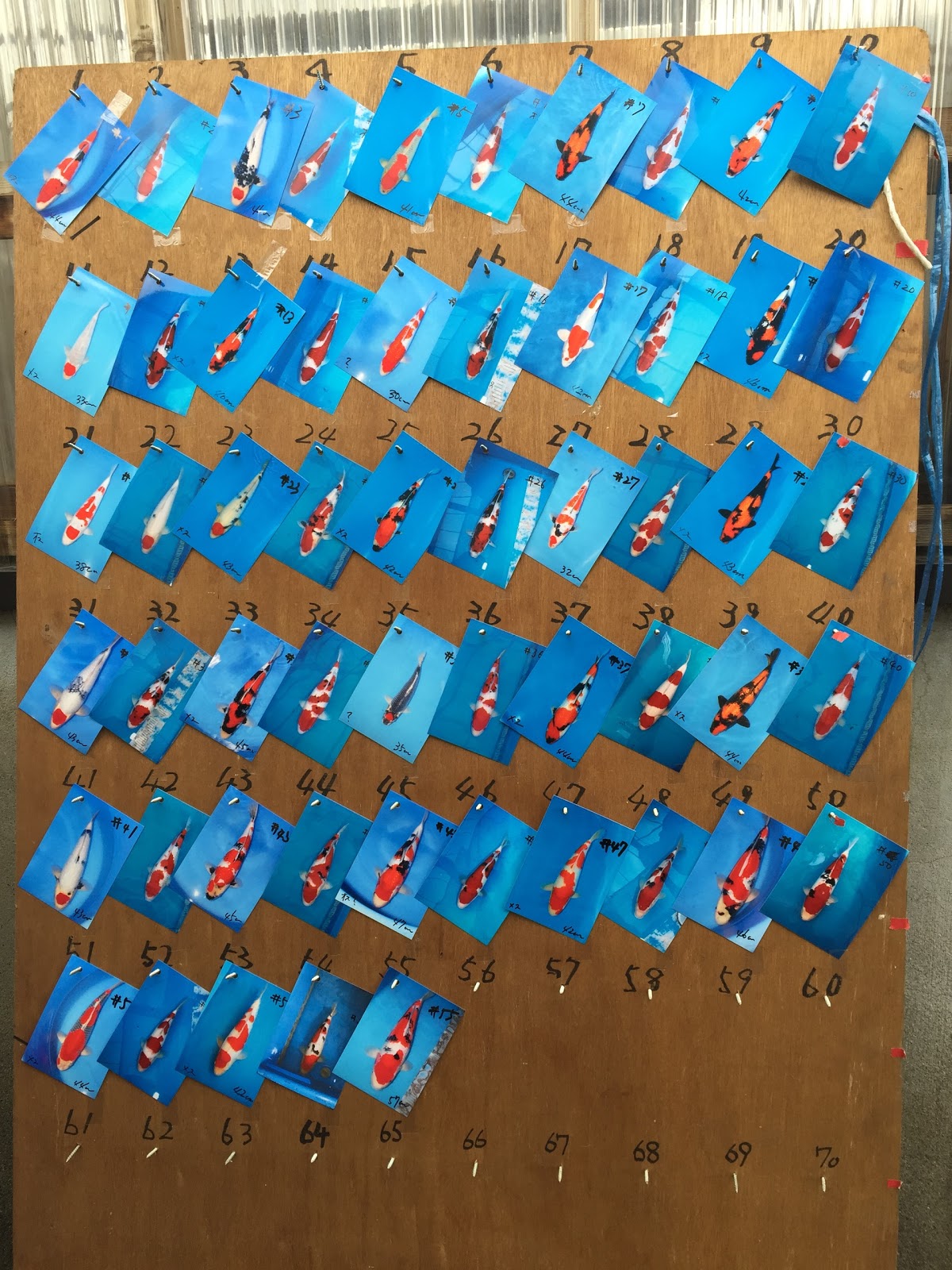 The auction setup was simple - in the car park next to Matsunosuke's Mushigame koi house, there was a gazebo, where the auction bidding happened. photographs of the koi being auctioned were pinned to a board, and the actual koi were held in two shows vats on the other side of the car part to the gazebo.