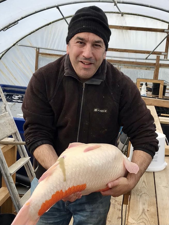 Here are 2 pictures taken earlier in May at around dawn on our spawning nights; they show us moving the sedated female koi into position before we manually strip the eggs. The females in these pictures will give you a clue as to what we are aiming for in in the round 1 mix. Please excuse how we look in these pictures… they’re taken at dawn, and we’ve been up for hours preceding that!