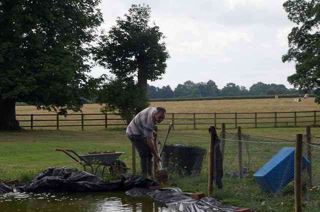 | After checking the kujaku's first thing this morning, I spend the rest of the morning mending the banks on horseshoe pond. This enabled me to pump water out of chestnut pond and store it in horseshoe pond. Amanda and I will reline chestnut pond one night this week and then we'll pump the water back. Saves time, and it's a more efficient use of the summer days I have remaining. |