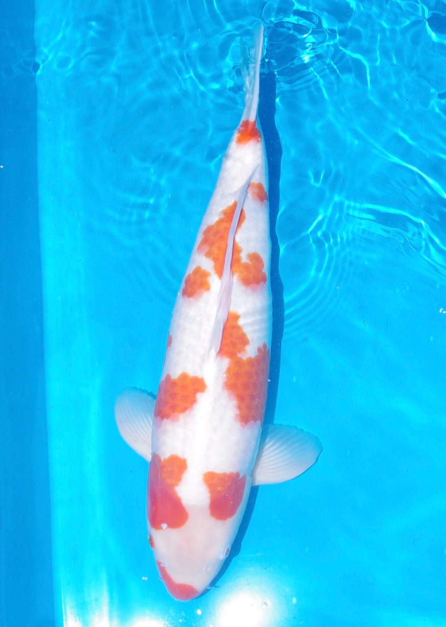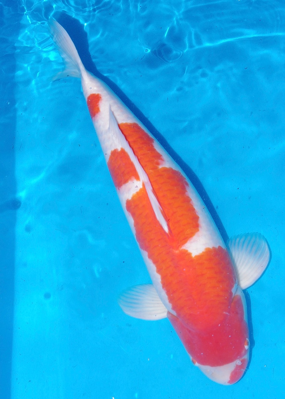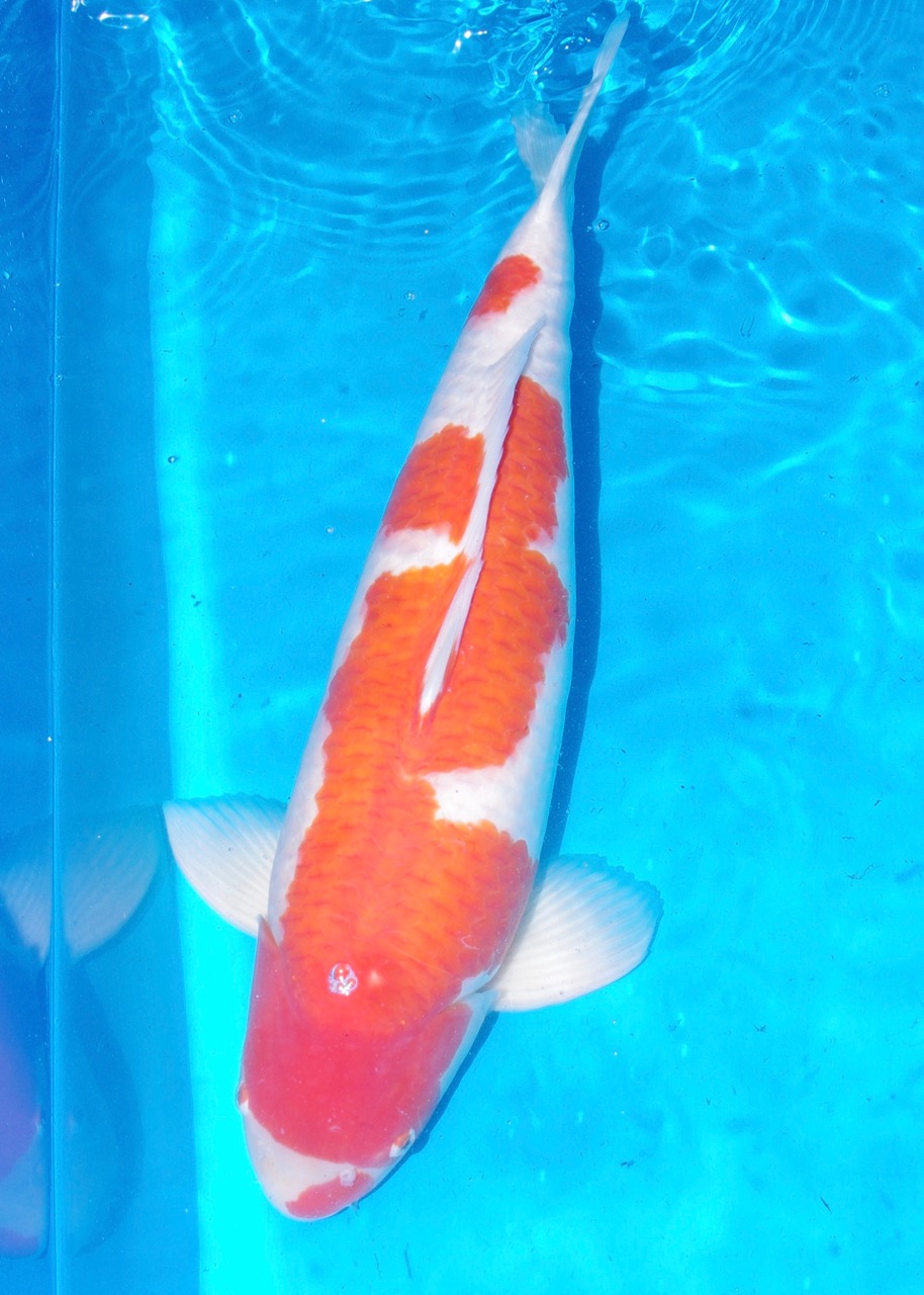 we've been tracking this since it was a very small koi, and it's not disappointed. I'm pretty sure it's male, but couldn't sex it conclusively. the sashi is tightening up, but still a little deep on the shoulder. one of the prettiest kohaku's we've bred.