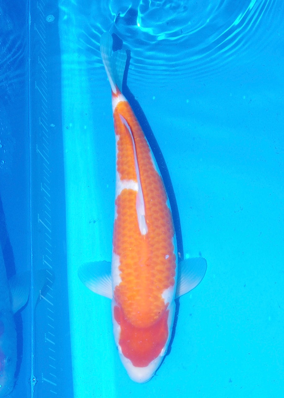 "Ray of Sunshine'.. was in my top 4 (along with 'Marmite', 'Map of England', the maruten .. gone to a new home and picture not to hand). But, sexed it as male during selection and I still think this is a great kohaku with a unique pattern. But, not as large as the other males - like the window kohaku 2 up the page.