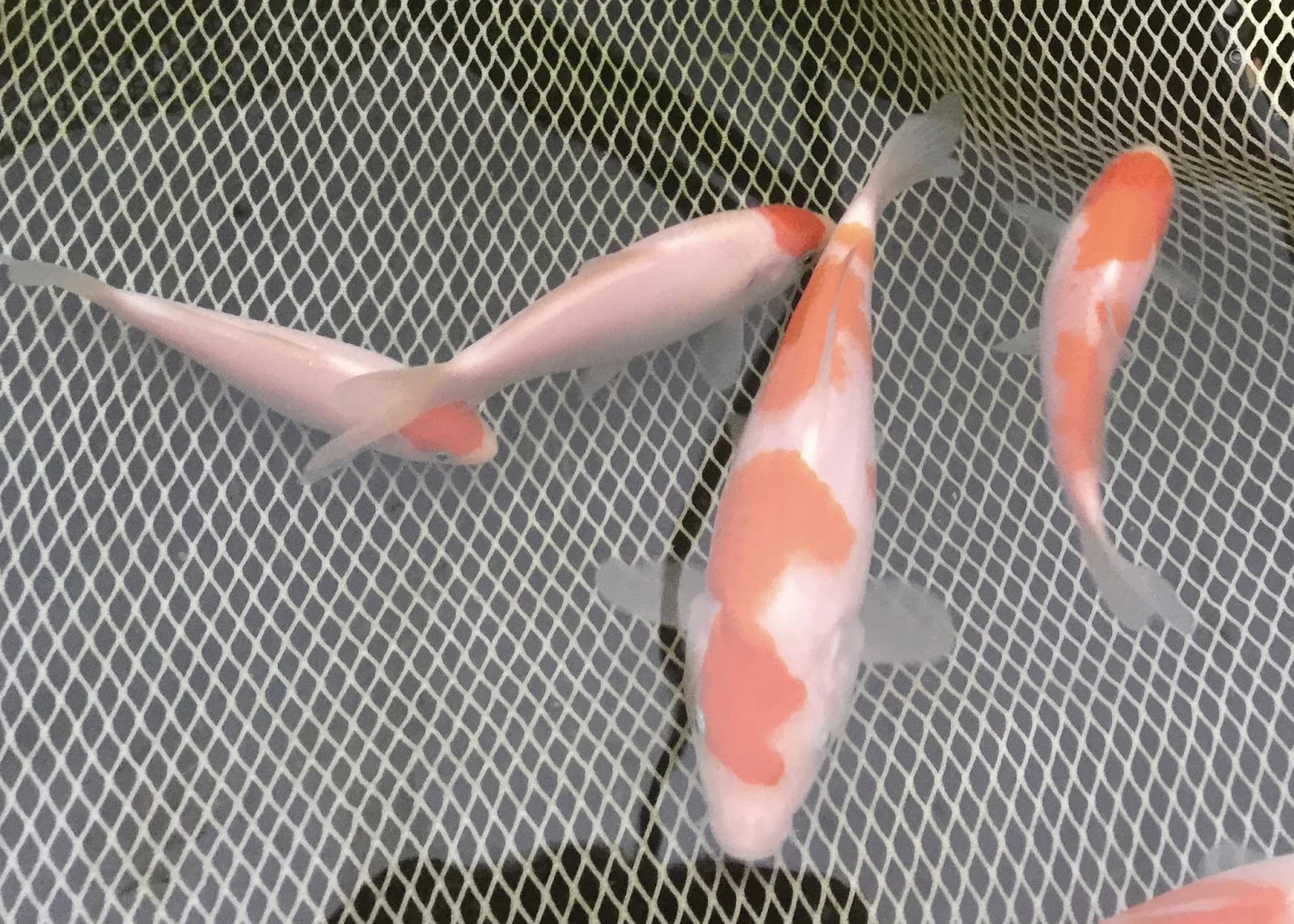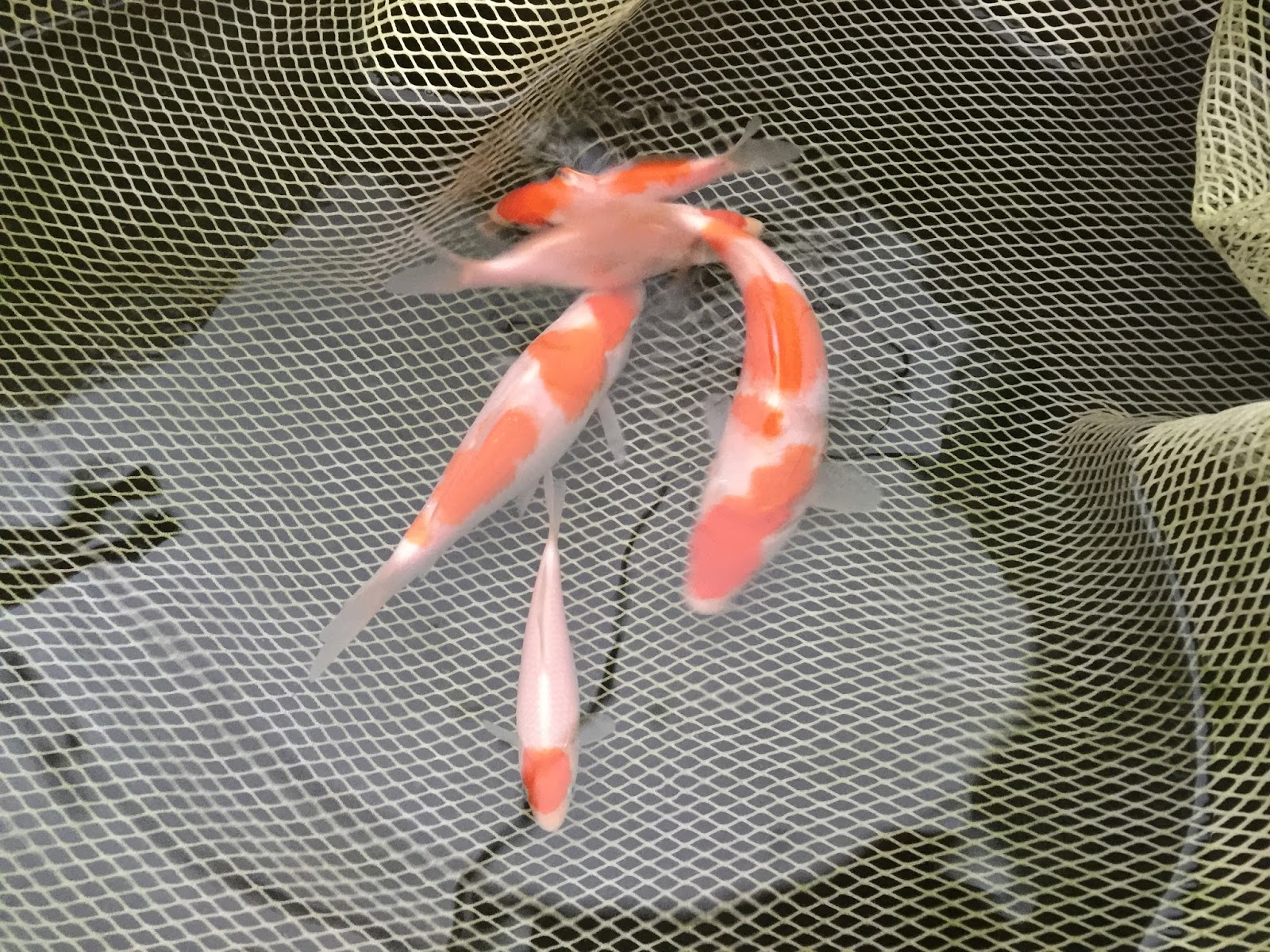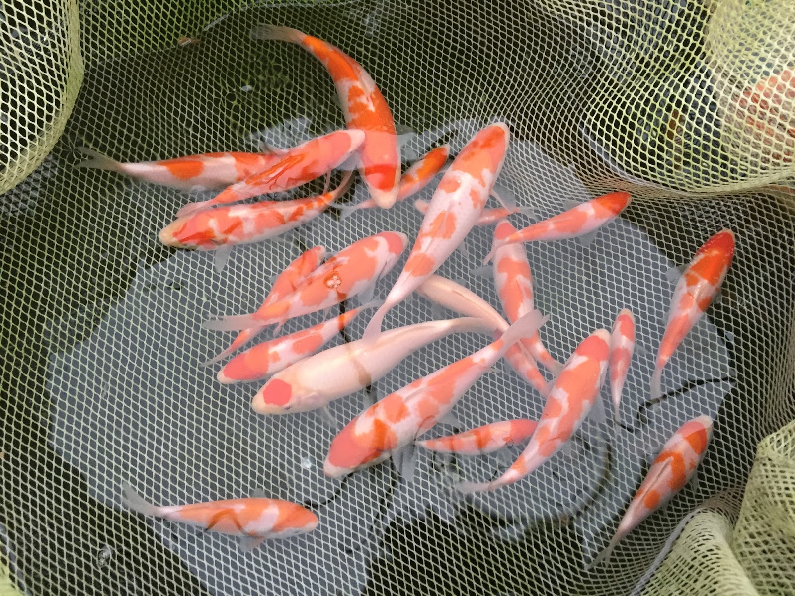 These are the fry that came from 'Sharkey' ; our momotaro kohaku female. a reminder of the story so far... the spawning at the end of June went really well, and we tried growing on fry in both outdoor ponds through July - but that stage of the rearing process did not go well. we harvested only around 5k fry for first selection out of both ponds, and there were one or two thousand more that we reared artificially indoors, that although came from the same spawning, were much further behind in terms of development. the keep rate at first selection was phenomenal, and went some way to rectifying the poor volume at first harvest.