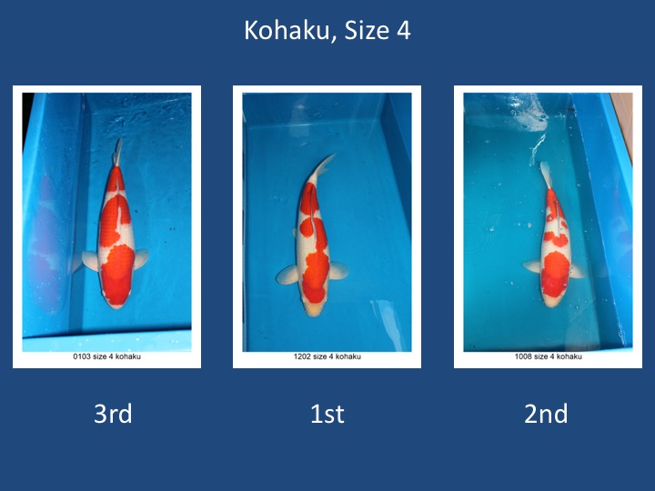 Here are the fish that placed in size 4 kohaku at the show, with Nigel's fish in second place.