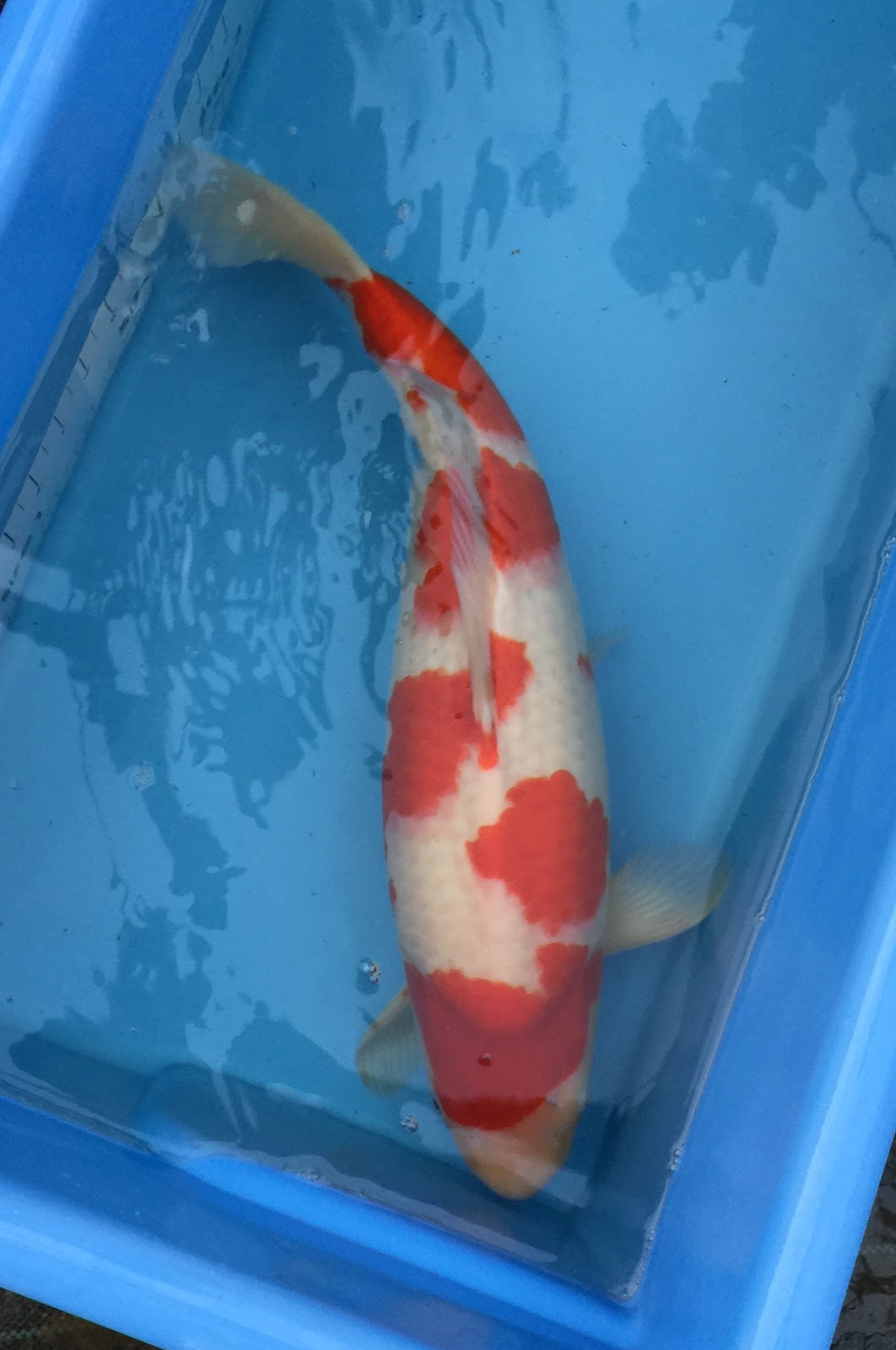 This is one of the kohaku's we entered - from the July 14 spawning. It's lengthened out nicely to 44cm, and was looking pretty good on the day. Some roughness felt on the gills during the handling of the koi suggests that this is a male kohaku.