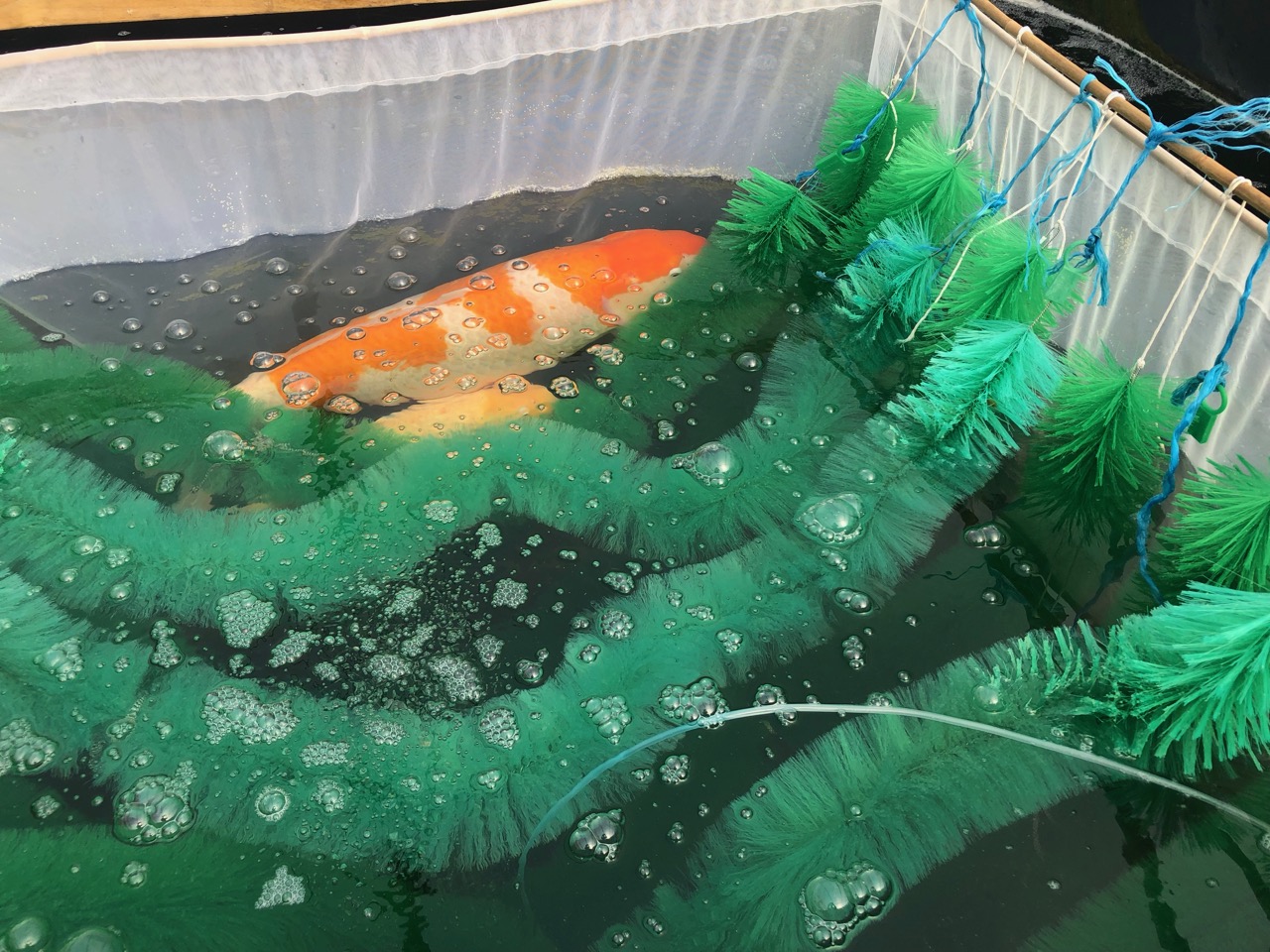 We started spawning this year on the weekend of 25th May, which is later that we’d usually start but has been delayed mainly because the end of April and first half of May being extremely busy with putting on our first stand at a koi show, and also the release of our jumbo tosai a week later. Occasionally, May offers us a warm few weeks which are enough to get a spawning and rear the fry outside. But, not this year – the odd warm day or few days gave us hope of a warm period which never set in. As things stand as I write this blog update, we are one third the way into June and the weather is still too cold. We couldn’t hold spawnings any further, and we are 2 weeks in to our spawning programme and have filled half of our expanded roster of fry ponds with hatchlings. It’s still too cold, but with the weather forecast saying we are still a week or two away from warmer weather… we have little choice but to crack on with it now and accept slower growth outdoors and just to make the best of it.
