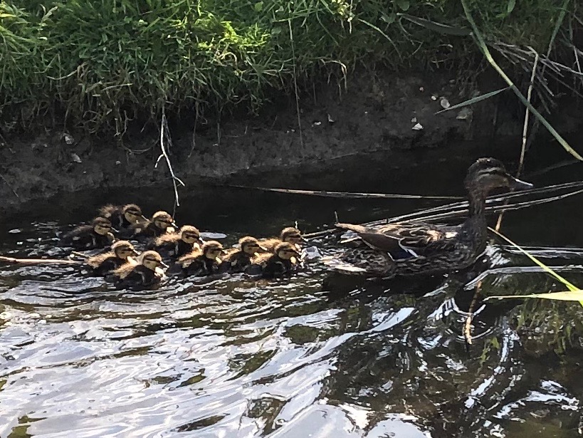 Our waste water pond is home to several batches of ducks and moorhens a year! She's done well with this, her latest batch of 10 ducklings! |