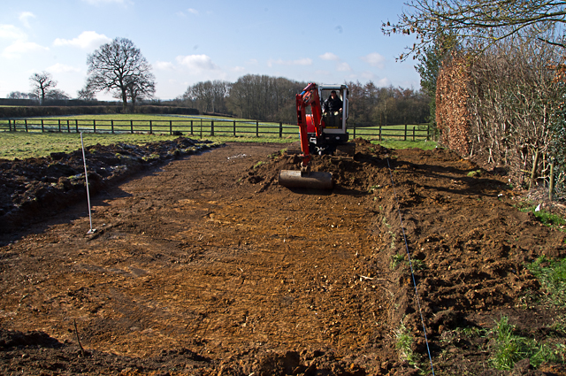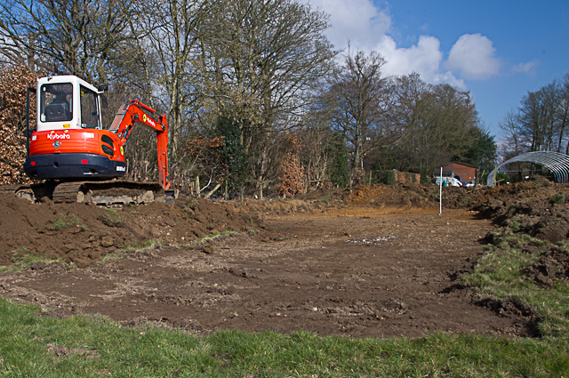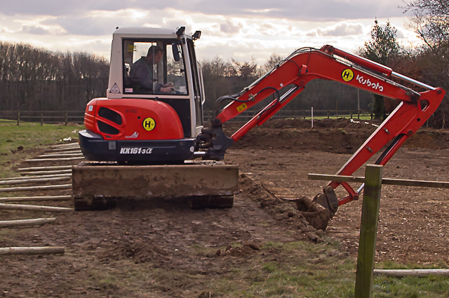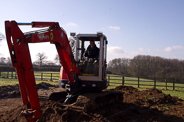 | Mark Davis manning the digger, compresses the pond sides to leave a smooth finish |