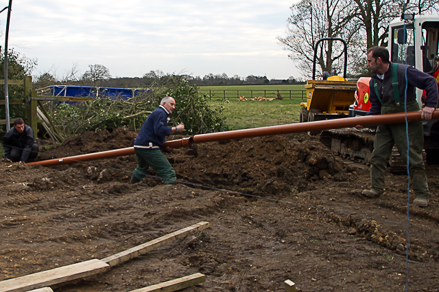 | Three men and a baby (well, the soil pipe). Waste water from the ponds in the polytunnel will flow through this waste pipe into a settlements pond. |