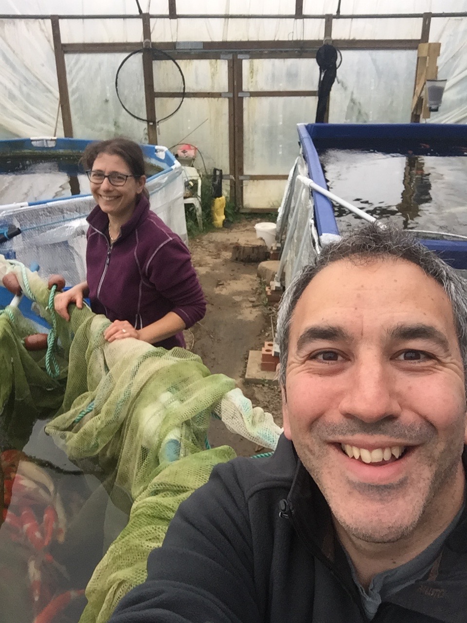Amanda and I seine netting the old tosai growing on system for the last time. We’ve cleared the tanks so they can be dismantled and the space cleared to make way for our new tosai growing on system. This will be the first of two tosai growing on systems.